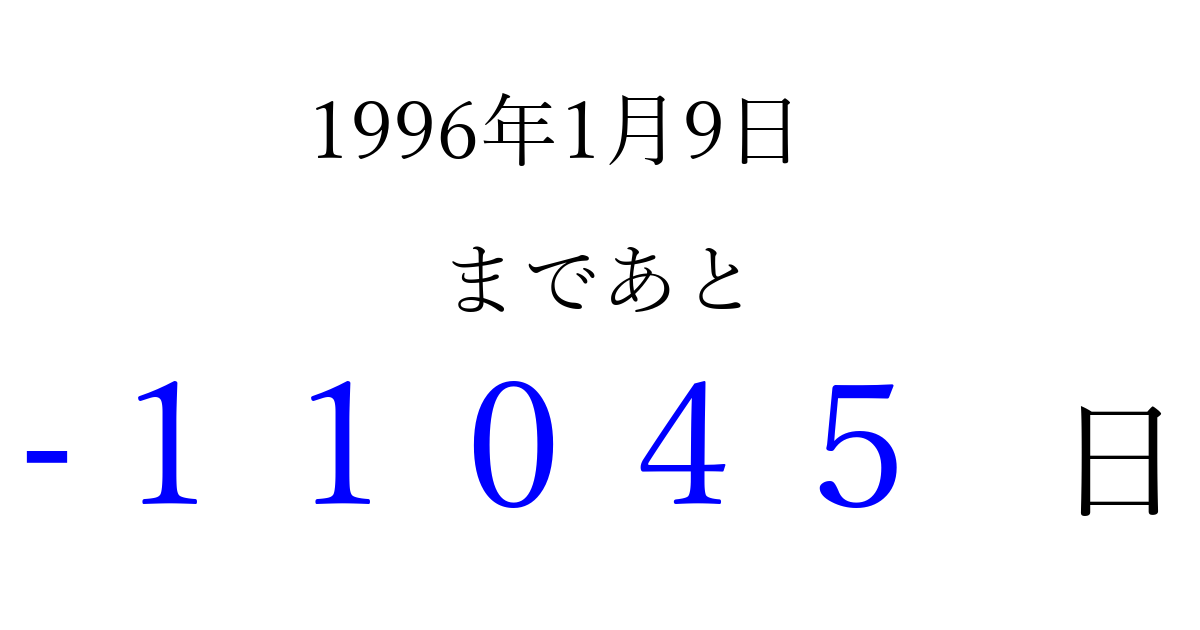 1996年1月9日(火)は もう 00000 日過ぎました 追加すると、トップページからすぐ選べるようになります ※2026/04/06現在の結果です。 最新の状態に更新する ↓シェアして、タイムライン上にカウントダウンを表示しよう!↓ 📤 この結果を共有する Tweet シェア Threads Bluesky 別の日付でカウントダウン 1996年1月のカレンダー このページをブックマークに追加すると、いつでもカウントダウンを確認できます。 (PC: Ctrl+D / Mac: ⌘+D) hitome-notes.comでは以下のページも運営しています。 指定日と期間から日付を計算 | ガチャ確率計算・シミュレーション | プライバシー・ポリシー 運営者:Avocado