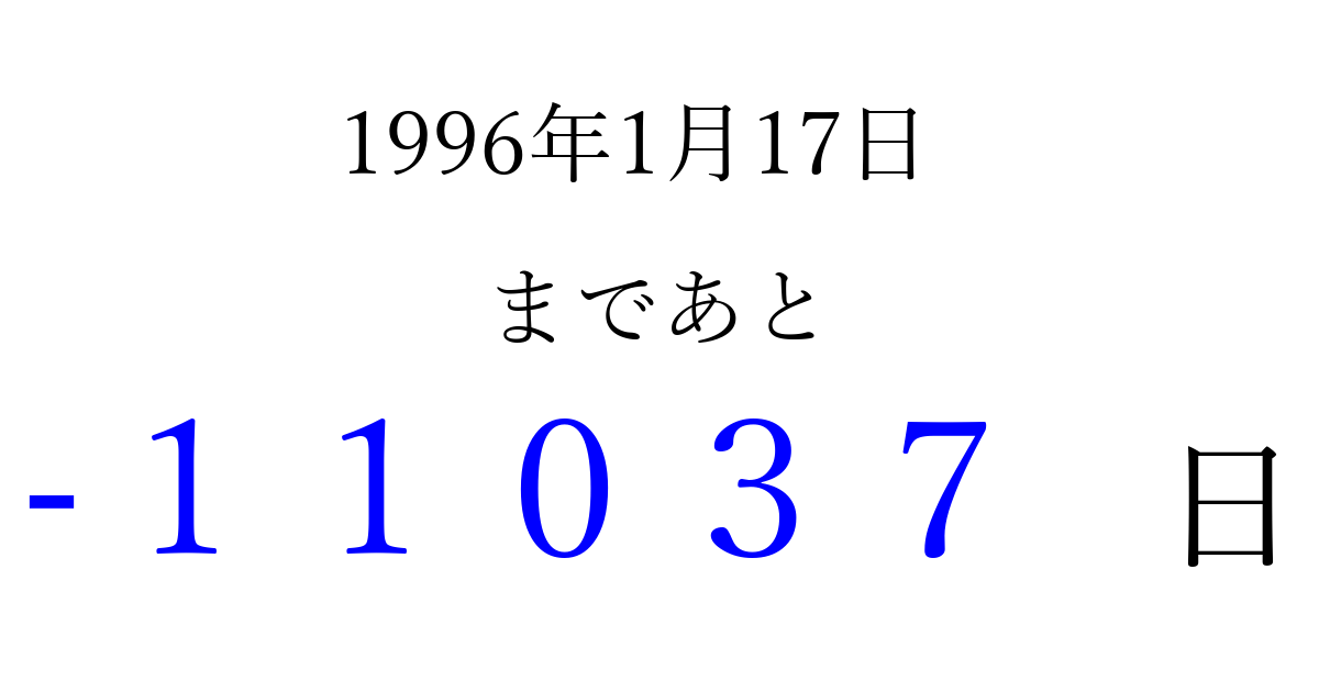 1996年1月17日(水)は もう 00000 日過ぎました 追加すると、トップページからすぐ選べるようになります ※2026/04/06現在の結果です。 最新の状態に更新する ↓シェアして、タイムライン上にカウントダウンを表示しよう!↓ 📤 この結果を共有する Tweet シェア Threads Bluesky 別の日付でカウントダウン 1996年1月のカレンダー このページをブックマークに追加すると、いつでもカウントダウンを確認できます。 (PC: Ctrl+D / Mac: ⌘+D) hitome-notes.comでは以下のページも運営しています。 指定日と期間から日付を計算 | ガチャ確率計算・シミュレーション | プライバシー・ポリシー 運営者:Avocado