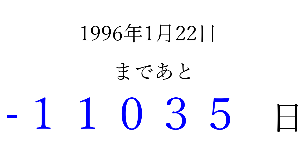 1996年1月22日(月)は もう 00000 日過ぎました 追加すると、トップページからすぐ選べるようになります ※2026/04/09現在の結果です。 最新の状態に更新する ↓シェアして、タイムライン上にカウントダウンを表示しよう!↓ 📤 この結果を共有する Tweet シェア Threads Bluesky 別の日付でカウントダウン 1996年1月のカレンダー このページをブックマークに追加すると、いつでもカウントダウンを確認できます。 (PC: Ctrl+D / Mac: ⌘+D) hitome-notes.comでは以下のページも運営しています。 指定日と期間から日付を計算 | ガチャ確率計算・シミュレーション | プライバシー・ポリシー 運営者:Avocado