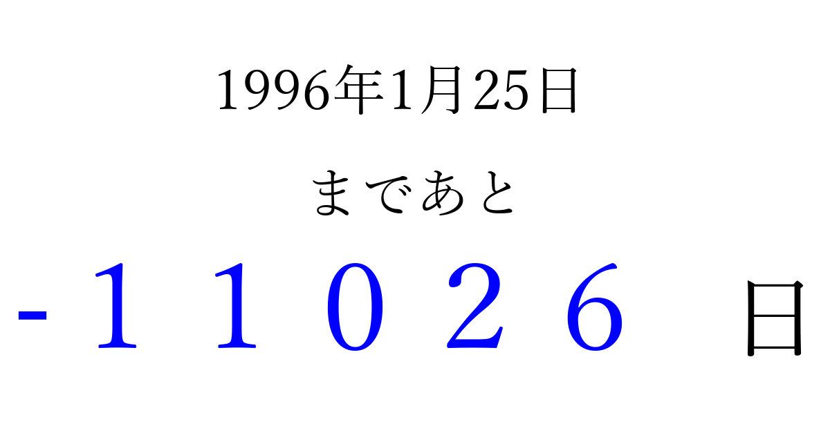 1996年1月25日(木)は もう 00000 日過ぎました 追加すると、トップページからすぐ選べるようになります ※2026/04/03現在の結果です。 最新の状態に更新する ↓シェアして、タイムライン上にカウントダウンを表示しよう!↓ 📤 この結果を共有する Tweet シェア Threads Bluesky 別の日付でカウントダウン 1996年1月のカレンダー このページをブックマークに追加すると、いつでもカウントダウンを確認できます。 (PC: Ctrl+D / Mac: ⌘+D) hitome-notes.comでは以下のページも運営しています。 指定日と期間から日付を計算 | ガチャ確率計算・シミュレーション | プライバシー・ポリシー 運営者:Avocado