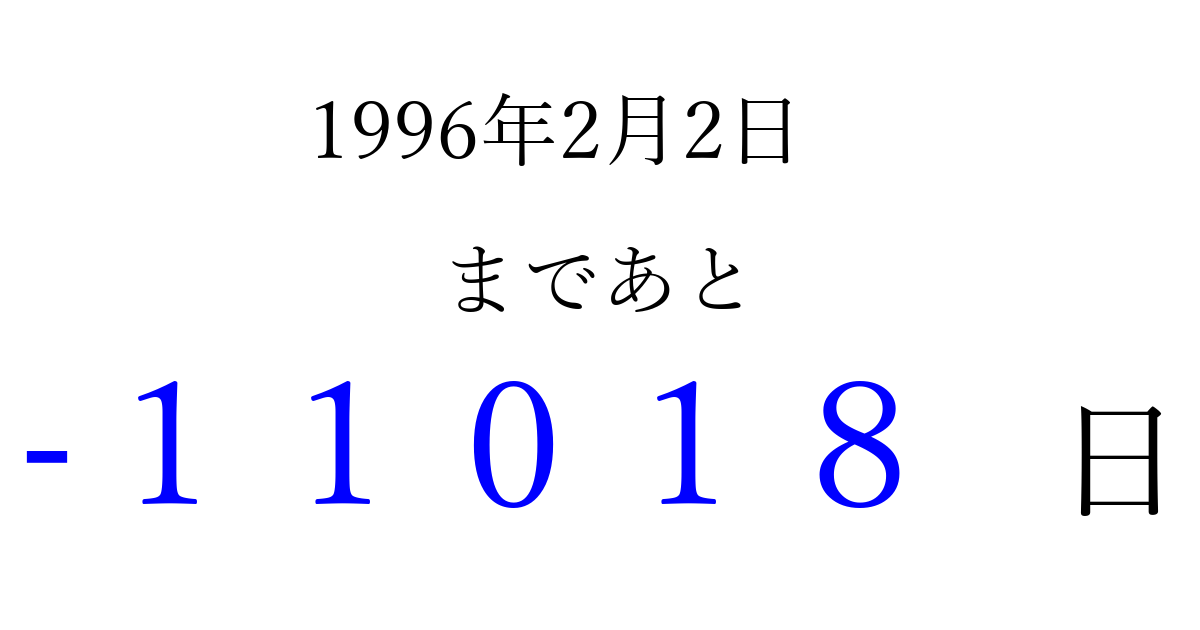 1996年2月2日(金)は もう 00000 日過ぎました 追加すると、トップページからすぐ選べるようになります ※2026/04/03現在の結果です。 最新の状態に更新する ↓シェアして、タイムライン上にカウントダウンを表示しよう!↓ 📤 この結果を共有する Tweet シェア Threads Bluesky 別の日付でカウントダウン 1996年2月のカレンダー このページをブックマークに追加すると、いつでもカウントダウンを確認できます。 (PC: Ctrl+D / Mac: ⌘+D) hitome-notes.comでは以下のページも運営しています。 指定日と期間から日付を計算 | ガチャ確率計算・シミュレーション | プライバシー・ポリシー 運営者:Avocado