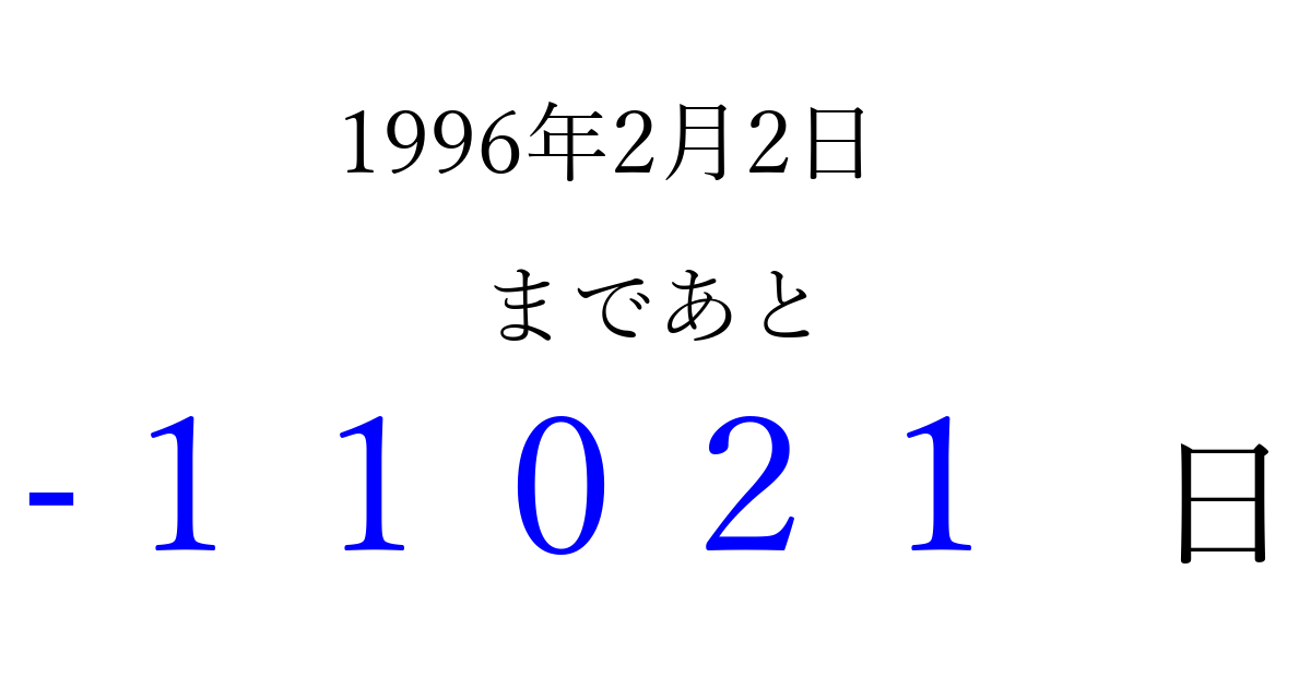 1996年2月2日(金)は もう 00000 日過ぎました 追加すると、トップページからすぐ選べるようになります ※2026/04/06現在の結果です。 最新の状態に更新する ↓シェアして、タイムライン上にカウントダウンを表示しよう!↓ 📤 この結果を共有する Tweet シェア Threads Bluesky 別の日付でカウントダウン 1996年2月のカレンダー このページをブックマークに追加すると、いつでもカウントダウンを確認できます。 (PC: Ctrl+D / Mac: ⌘+D) hitome-notes.comでは以下のページも運営しています。 指定日と期間から日付を計算 | ガチャ確率計算・シミュレーション | プライバシー・ポリシー 運営者:Avocado