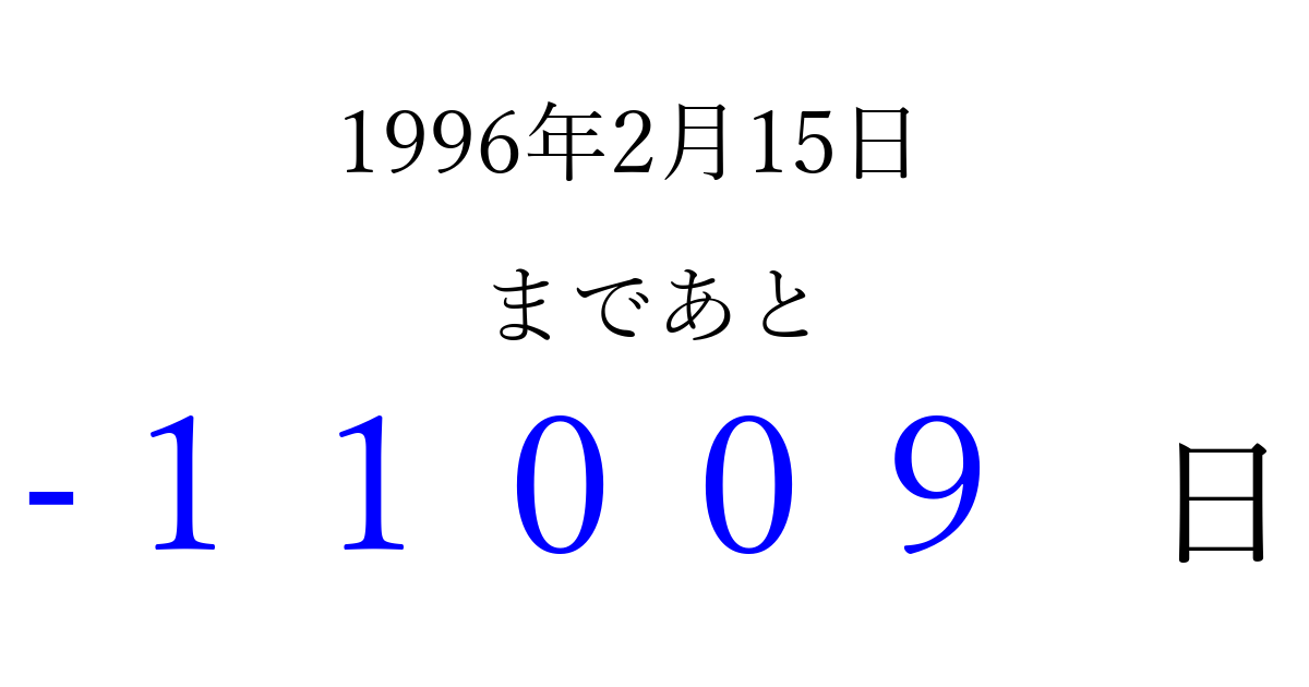 1996年2月15日(木)は もう 00000 日過ぎました 追加すると、トップページからすぐ選べるようになります ※2026/04/07現在の結果です。 最新の状態に更新する ↓シェアして、タイムライン上にカウントダウンを表示しよう!↓ 📤 この結果を共有する Tweet シェア Threads Bluesky 別の日付でカウントダウン 1996年2月のカレンダー このページをブックマークに追加すると、いつでもカウントダウンを確認できます。 (PC: Ctrl+D / Mac: ⌘+D) hitome-notes.comでは以下のページも運営しています。 指定日と期間から日付を計算 | ガチャ確率計算・シミュレーション | プライバシー・ポリシー 運営者:Avocado