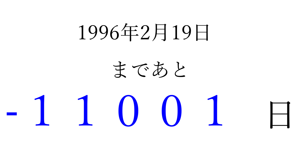 1996年2月19日(月)は もう 00000 日過ぎました 追加すると、トップページからすぐ選べるようになります ※2026/04/03現在の結果です。 最新の状態に更新する ↓シェアして、タイムライン上にカウントダウンを表示しよう!↓ 📤 この結果を共有する Tweet シェア Threads Bluesky 別の日付でカウントダウン 1996年2月のカレンダー このページをブックマークに追加すると、いつでもカウントダウンを確認できます。 (PC: Ctrl+D / Mac: ⌘+D) hitome-notes.comでは以下のページも運営しています。 指定日と期間から日付を計算 | ガチャ確率計算・シミュレーション | プライバシー・ポリシー 運営者:Avocado