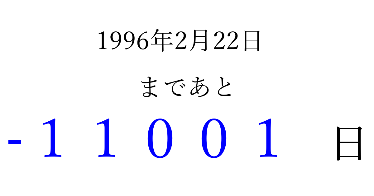 1996年2月22日(木)は もう 00000 日過ぎました 追加すると、トップページからすぐ選べるようになります ※2026/04/06現在の結果です。 最新の状態に更新する ↓シェアして、タイムライン上にカウントダウンを表示しよう!↓ 📤 この結果を共有する Tweet シェア Threads Bluesky 別の日付でカウントダウン 1996年2月のカレンダー このページをブックマークに追加すると、いつでもカウントダウンを確認できます。 (PC: Ctrl+D / Mac: ⌘+D) hitome-notes.comでは以下のページも運営しています。 指定日と期間から日付を計算 | ガチャ確率計算・シミュレーション | プライバシー・ポリシー 運営者:Avocado