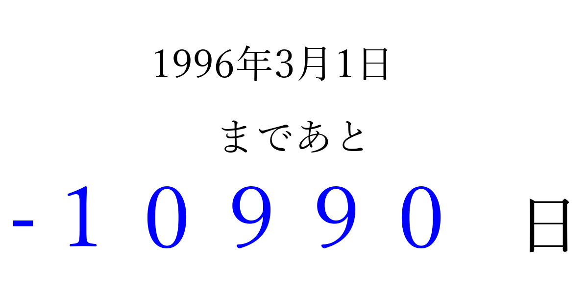 1996年3月1日(金)は もう 00000 日過ぎました 追加すると、トップページからすぐ選べるようになります ※2026/04/03現在の結果です。 最新の状態に更新する ↓シェアして、タイムライン上にカウントダウンを表示しよう!↓ 📤 この結果を共有する Tweet シェア Threads Bluesky 別の日付でカウントダウン 1996年3月のカレンダー このページをブックマークに追加すると、いつでもカウントダウンを確認できます。 (PC: Ctrl+D / Mac: ⌘+D) hitome-notes.comでは以下のページも運営しています。 指定日と期間から日付を計算 | ガチャ確率計算・シミュレーション | プライバシー・ポリシー 運営者:Avocado