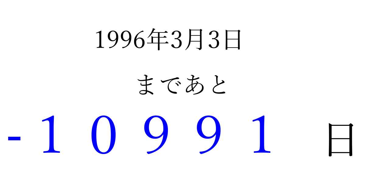 1996年3月3日(日)は もう 00000 日過ぎました 追加すると、トップページからすぐ選べるようになります ※2026/04/06現在の結果です。 最新の状態に更新する ↓シェアして、タイムライン上にカウントダウンを表示しよう!↓ 📤 この結果を共有する Tweet シェア Threads Bluesky 別の日付でカウントダウン 1996年3月のカレンダー このページをブックマークに追加すると、いつでもカウントダウンを確認できます。 (PC: Ctrl+D / Mac: ⌘+D) hitome-notes.comでは以下のページも運営しています。 指定日と期間から日付を計算 | ガチャ確率計算・シミュレーション | プライバシー・ポリシー 運営者:Avocado
