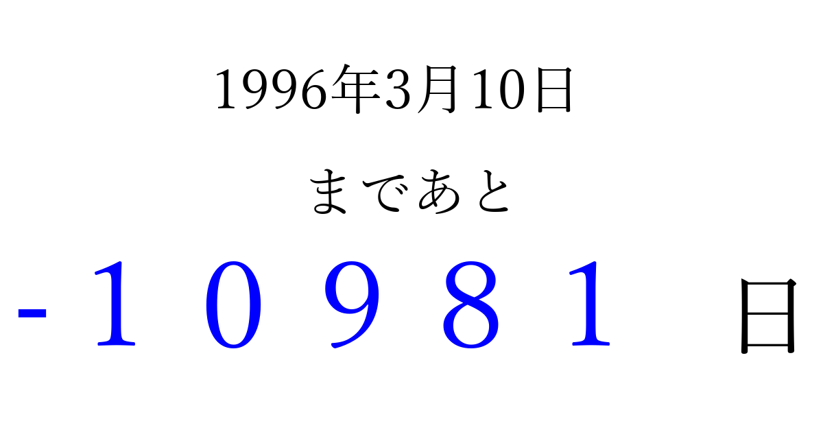 1996年3月10日(日)は もう 00000 日過ぎました 追加すると、トップページからすぐ選べるようになります ※2026/04/03現在の結果です。 最新の状態に更新する ↓シェアして、タイムライン上にカウントダウンを表示しよう!↓ 📤 この結果を共有する Tweet シェア Threads Bluesky 別の日付でカウントダウン 1996年3月のカレンダー このページをブックマークに追加すると、いつでもカウントダウンを確認できます。 (PC: Ctrl+D / Mac: ⌘+D) hitome-notes.comでは以下のページも運営しています。 指定日と期間から日付を計算 | ガチャ確率計算・シミュレーション | プライバシー・ポリシー 運営者:Avocado