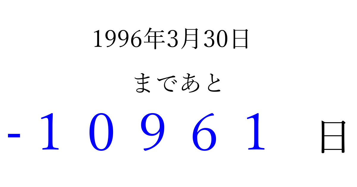 1996年3月30日(土)は もう 00000 日過ぎました 追加すると、トップページからすぐ選べるようになります ※2026/04/03現在の結果です。 最新の状態に更新する ↓シェアして、タイムライン上にカウントダウンを表示しよう!↓ 📤 この結果を共有する Tweet シェア Threads Bluesky 別の日付でカウントダウン 1996年3月のカレンダー このページをブックマークに追加すると、いつでもカウントダウンを確認できます。 (PC: Ctrl+D / Mac: ⌘+D) hitome-notes.comでは以下のページも運営しています。 指定日と期間から日付を計算 | ガチャ確率計算・シミュレーション | プライバシー・ポリシー 運営者:Avocado