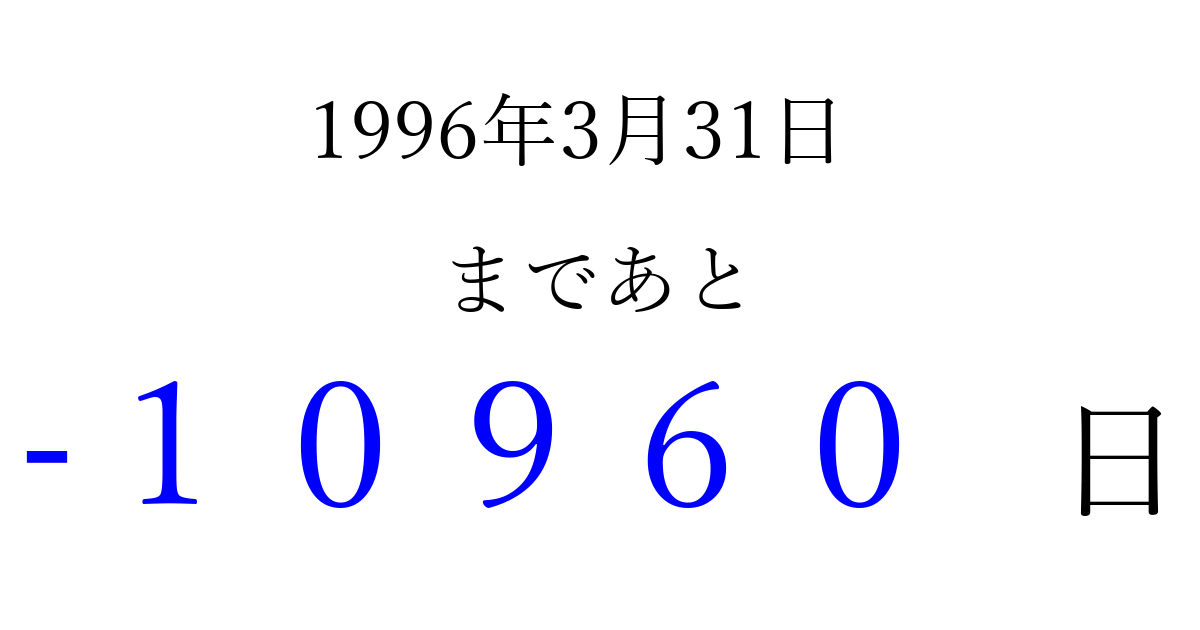 1996年3月31日(日)は もう 00000 日過ぎました 追加すると、トップページからすぐ選べるようになります ※2026/04/03現在の結果です。 最新の状態に更新する ↓シェアして、タイムライン上にカウントダウンを表示しよう!↓ 📤 この結果を共有する Tweet シェア Threads Bluesky 別の日付でカウントダウン 1996年3月のカレンダー このページをブックマークに追加すると、いつでもカウントダウンを確認できます。 (PC: Ctrl+D / Mac: ⌘+D) hitome-notes.comでは以下のページも運営しています。 指定日と期間から日付を計算 | ガチャ確率計算・シミュレーション | プライバシー・ポリシー 運営者:Avocado