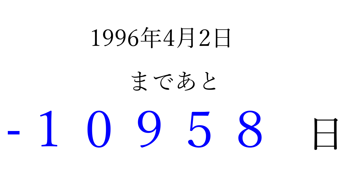 1996年4月2日(火)は もう 00000 日過ぎました 追加すると、トップページからすぐ選べるようになります ※2026/04/03現在の結果です。 最新の状態に更新する ↓シェアして、タイムライン上にカウントダウンを表示しよう!↓ 📤 この結果を共有する Tweet シェア Threads Bluesky 別の日付でカウントダウン 1996年4月のカレンダー このページをブックマークに追加すると、いつでもカウントダウンを確認できます。 (PC: Ctrl+D / Mac: ⌘+D) hitome-notes.comでは以下のページも運営しています。 指定日と期間から日付を計算 | ガチャ確率計算・シミュレーション | プライバシー・ポリシー 運営者:Avocado