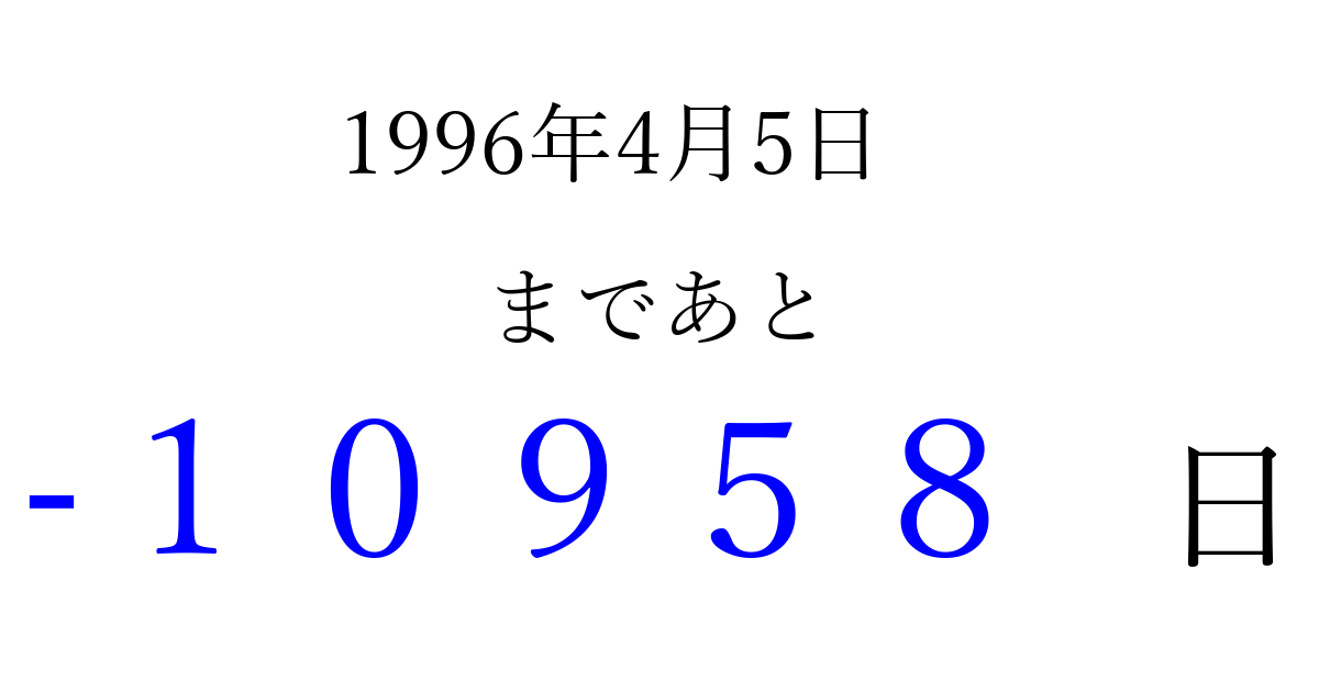 1996年4月5日(金)は もう 00000 日過ぎました 追加すると、トップページからすぐ選べるようになります ※2026/04/06現在の結果です。 最新の状態に更新する ↓シェアして、タイムライン上にカウントダウンを表示しよう!↓ 📤 この結果を共有する Tweet シェア Threads Bluesky 別の日付でカウントダウン 1996年4月のカレンダー このページをブックマークに追加すると、いつでもカウントダウンを確認できます。 (PC: Ctrl+D / Mac: ⌘+D) hitome-notes.comでは以下のページも運営しています。 指定日と期間から日付を計算 | ガチャ確率計算・シミュレーション | プライバシー・ポリシー 運営者:Avocado