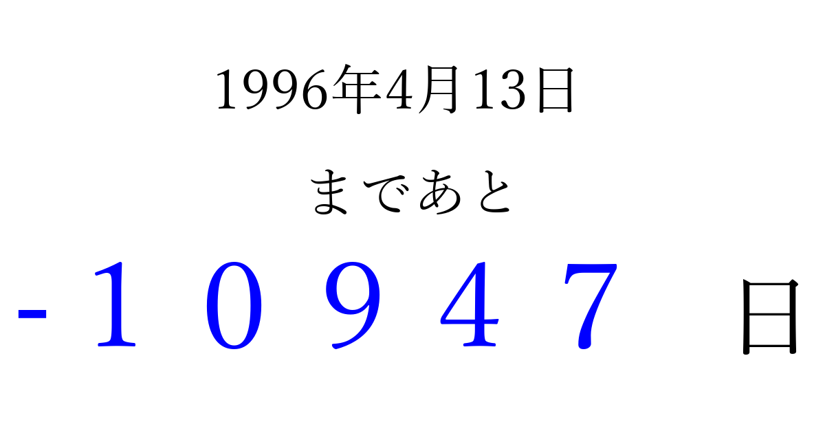 1996年4月13日(土)は もう 00000 日過ぎました 追加すると、トップページからすぐ選べるようになります ※2026/04/03現在の結果です。 最新の状態に更新する ↓シェアして、タイムライン上にカウントダウンを表示しよう!↓ 📤 この結果を共有する Tweet シェア Threads Bluesky 別の日付でカウントダウン 1996年4月のカレンダー このページをブックマークに追加すると、いつでもカウントダウンを確認できます。 (PC: Ctrl+D / Mac: ⌘+D) hitome-notes.comでは以下のページも運営しています。 指定日と期間から日付を計算 | ガチャ確率計算・シミュレーション | プライバシー・ポリシー 運営者:Avocado