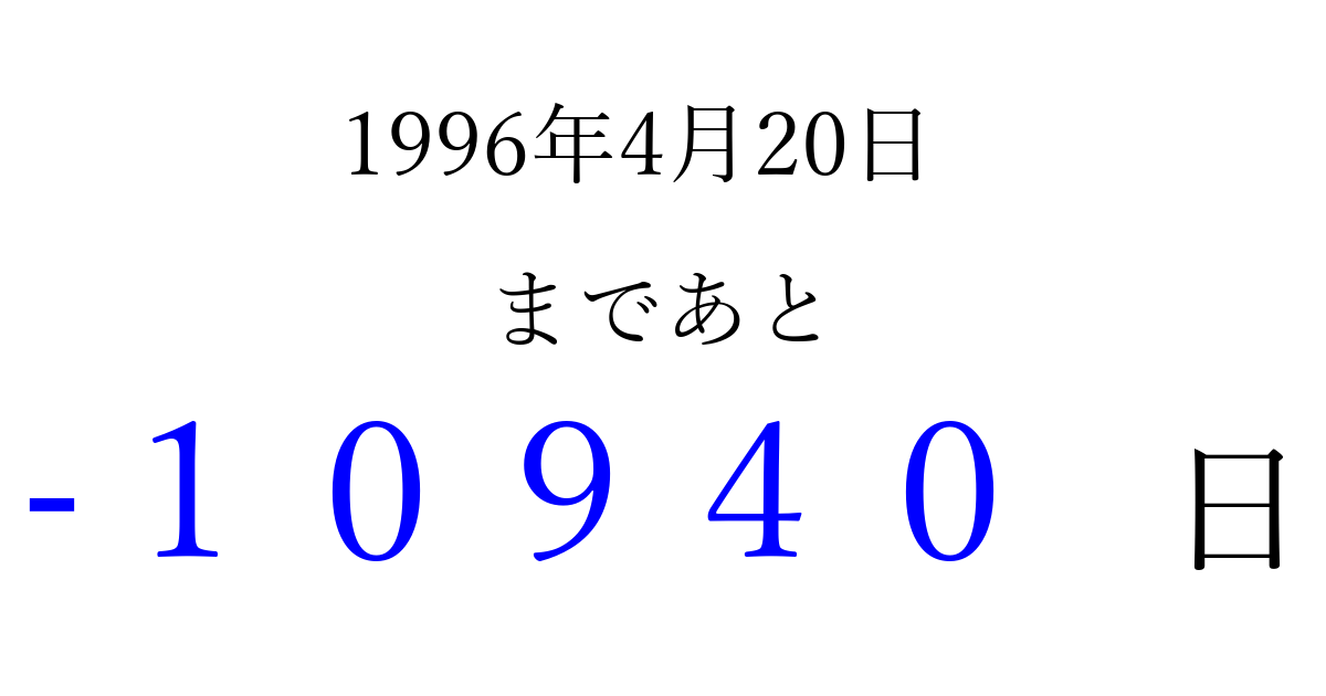 1996年4月20日(土)は もう 00000 日過ぎました 追加すると、トップページからすぐ選べるようになります ※2026/04/03現在の結果です。 最新の状態に更新する ↓シェアして、タイムライン上にカウントダウンを表示しよう!↓ 📤 この結果を共有する Tweet シェア Threads Bluesky 別の日付でカウントダウン 1996年4月のカレンダー このページをブックマークに追加すると、いつでもカウントダウンを確認できます。 (PC: Ctrl+D / Mac: ⌘+D) hitome-notes.comでは以下のページも運営しています。 指定日と期間から日付を計算 | ガチャ確率計算・シミュレーション | プライバシー・ポリシー 運営者:Avocado