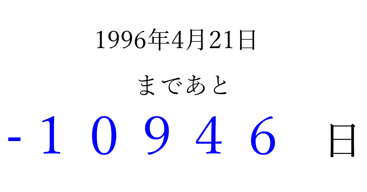1996年4月21日(日)は もう 00000 日過ぎました 追加すると、トップページからすぐ選べるようになります ※2026/04/10現在の結果です。 最新の状態に更新する ↓シェアして、タイムライン上にカウントダウンを表示しよう!↓ 📤 この結果を共有する Tweet シェア Threads Bluesky 別の日付でカウントダウン 1996年4月のカレンダー このページをブックマークに追加すると、いつでもカウントダウンを確認できます。 (PC: Ctrl+D / Mac: ⌘+D) hitome-notes.comでは以下のページも運営しています。 指定日と期間から日付を計算 | ガチャ確率計算・シミュレーション | プライバシー・ポリシー 運営者:Avocado