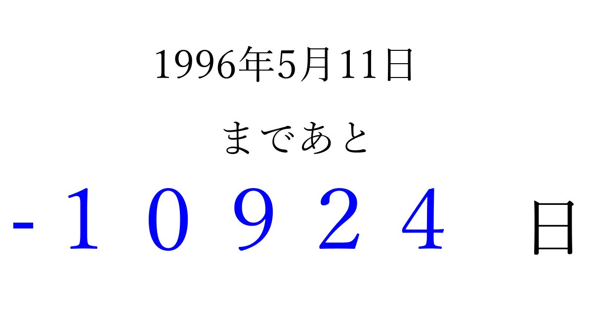 1996年5月11日(土)は もう 00000 日過ぎました 追加すると、トップページからすぐ選べるようになります ※2026/04/08現在の結果です。 最新の状態に更新する ↓シェアして、タイムライン上にカウントダウンを表示しよう!↓ 📤 この結果を共有する Tweet シェア Threads Bluesky 別の日付でカウントダウン 1996年5月のカレンダー このページをブックマークに追加すると、いつでもカウントダウンを確認できます。 (PC: Ctrl+D / Mac: ⌘+D) hitome-notes.comでは以下のページも運営しています。 指定日と期間から日付を計算 | ガチャ確率計算・シミュレーション | プライバシー・ポリシー 運営者:Avocado