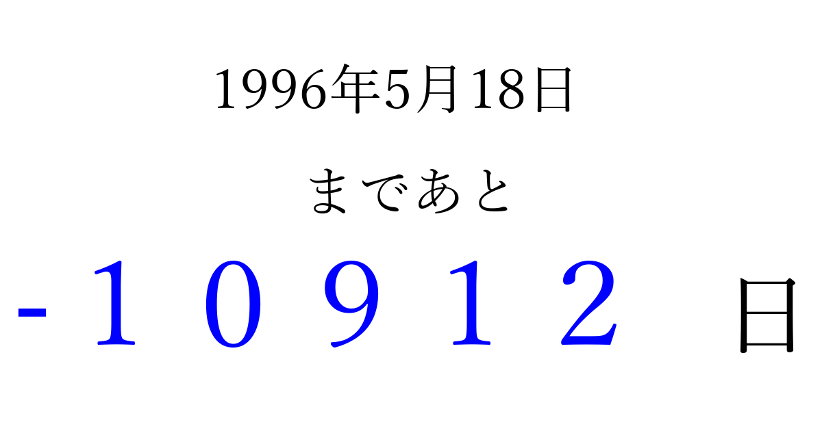1996年5月18日(土)は もう 00000 日過ぎました 追加すると、トップページからすぐ選べるようになります ※2026/04/03現在の結果です。 最新の状態に更新する ↓シェアして、タイムライン上にカウントダウンを表示しよう!↓ 📤 この結果を共有する Tweet シェア Threads Bluesky 別の日付でカウントダウン 1996年5月のカレンダー このページをブックマークに追加すると、いつでもカウントダウンを確認できます。 (PC: Ctrl+D / Mac: ⌘+D) hitome-notes.comでは以下のページも運営しています。 指定日と期間から日付を計算 | ガチャ確率計算・シミュレーション | プライバシー・ポリシー 運営者:Avocado