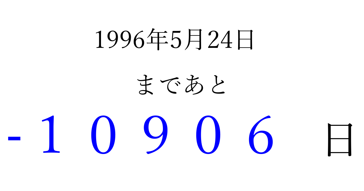 1996年5月24日(金)は もう 00000 日過ぎました 追加すると、トップページからすぐ選べるようになります ※2026/04/03現在の結果です。 最新の状態に更新する ↓シェアして、タイムライン上にカウントダウンを表示しよう!↓ 📤 この結果を共有する Tweet シェア Threads Bluesky 別の日付でカウントダウン 1996年5月のカレンダー このページをブックマークに追加すると、いつでもカウントダウンを確認できます。 (PC: Ctrl+D / Mac: ⌘+D) hitome-notes.comでは以下のページも運営しています。 指定日と期間から日付を計算 | ガチャ確率計算・シミュレーション | プライバシー・ポリシー 運営者:Avocado