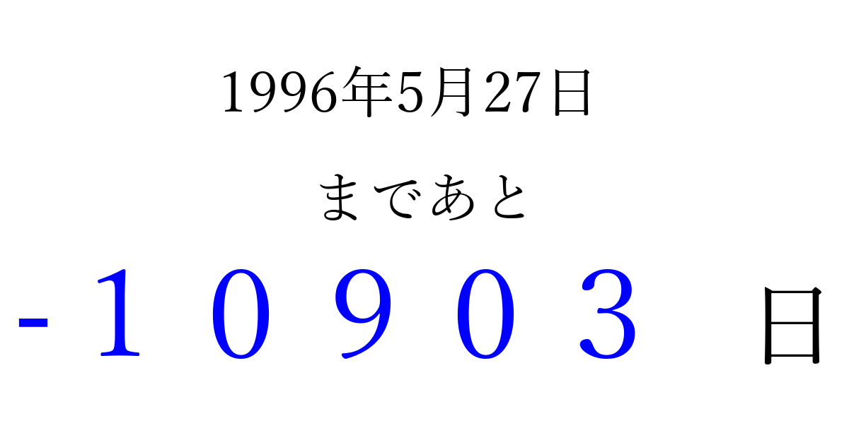 1996年5月27日(月)は もう 00000 日過ぎました 追加すると、トップページからすぐ選べるようになります ※2026/04/03現在の結果です。 最新の状態に更新する ↓シェアして、タイムライン上にカウントダウンを表示しよう!↓ 📤 この結果を共有する Tweet シェア Threads Bluesky 別の日付でカウントダウン 1996年5月のカレンダー このページをブックマークに追加すると、いつでもカウントダウンを確認できます。 (PC: Ctrl+D / Mac: ⌘+D) hitome-notes.comでは以下のページも運営しています。 指定日と期間から日付を計算 | ガチャ確率計算・シミュレーション | プライバシー・ポリシー 運営者:Avocado
