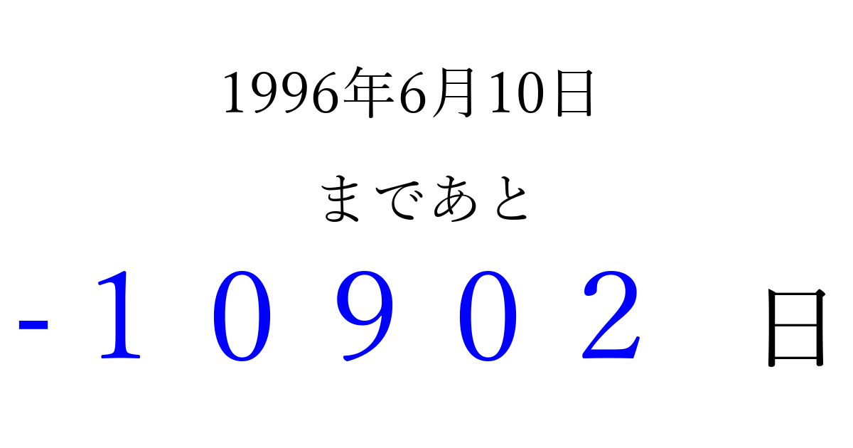 1996年6月10日(月)は もう 00000 日過ぎました 追加すると、トップページからすぐ選べるようになります ※2026/04/16現在の結果です。 最新の状態に更新する ↓シェアして、タイムライン上にカウントダウンを表示しよう!↓ 📤 この結果を共有する Tweet シェア Threads Bluesky 別の日付でカウントダウン 1996年6月のカレンダー このページをブックマークに追加すると、いつでもカウントダウンを確認できます。 (PC: Ctrl+D / Mac: ⌘+D) hitome-notes.comでは以下のページも運営しています。 指定日と期間から日付を計算 | ガチャ確率計算・シミュレーション | プライバシー・ポリシー 運営者:Avocado