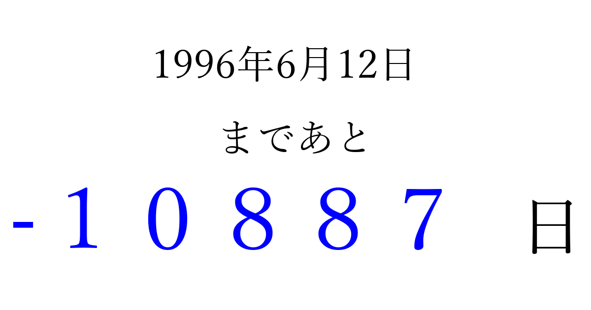 1996年6月12日(水)は もう 00000 日過ぎました 追加すると、トップページからすぐ選べるようになります ※2026/04/03現在の結果です。 最新の状態に更新する ↓シェアして、タイムライン上にカウントダウンを表示しよう!↓ 📤 この結果を共有する Tweet シェア Threads Bluesky 別の日付でカウントダウン 1996年6月のカレンダー このページをブックマークに追加すると、いつでもカウントダウンを確認できます。 (PC: Ctrl+D / Mac: ⌘+D) hitome-notes.comでは以下のページも運営しています。 指定日と期間から日付を計算 | ガチャ確率計算・シミュレーション | プライバシー・ポリシー 運営者:Avocado