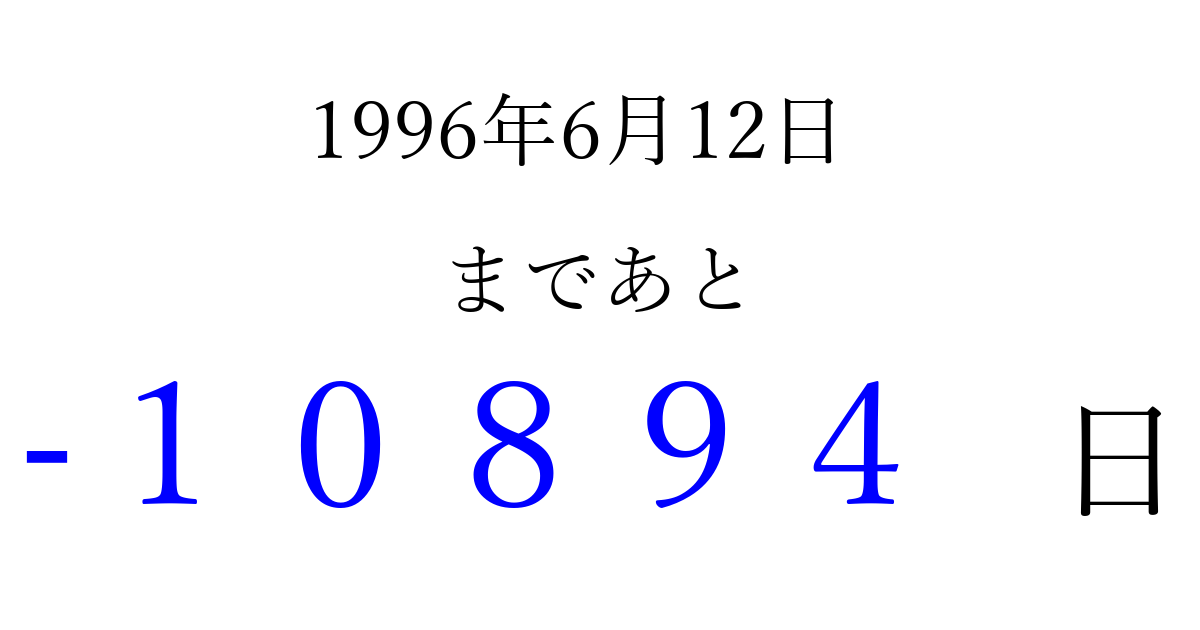 1996年6月12日(水)は もう 00000 日過ぎました 追加すると、トップページからすぐ選べるようになります ※2026/04/10現在の結果です。 最新の状態に更新する ↓シェアして、タイムライン上にカウントダウンを表示しよう!↓ 📤 この結果を共有する Tweet シェア Threads Bluesky 別の日付でカウントダウン 1996年6月のカレンダー このページをブックマークに追加すると、いつでもカウントダウンを確認できます。 (PC: Ctrl+D / Mac: ⌘+D) hitome-notes.comでは以下のページも運営しています。 指定日と期間から日付を計算 | ガチャ確率計算・シミュレーション | プライバシー・ポリシー 運営者:Avocado