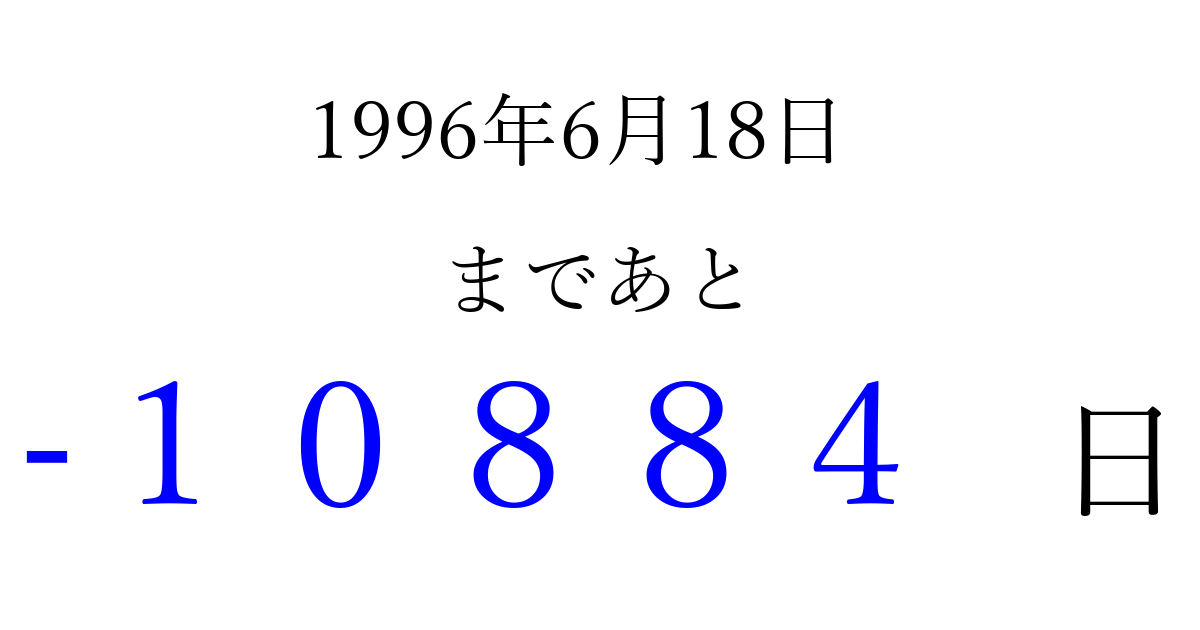 1996年6月18日(火)は もう 00000 日過ぎました 追加すると、トップページからすぐ選べるようになります ※2026/04/06現在の結果です。 最新の状態に更新する ↓シェアして、タイムライン上にカウントダウンを表示しよう!↓ 📤 この結果を共有する Tweet シェア Threads Bluesky 別の日付でカウントダウン 1996年6月のカレンダー このページをブックマークに追加すると、いつでもカウントダウンを確認できます。 (PC: Ctrl+D / Mac: ⌘+D) hitome-notes.comでは以下のページも運営しています。 指定日と期間から日付を計算 | ガチャ確率計算・シミュレーション | プライバシー・ポリシー 運営者:Avocado
