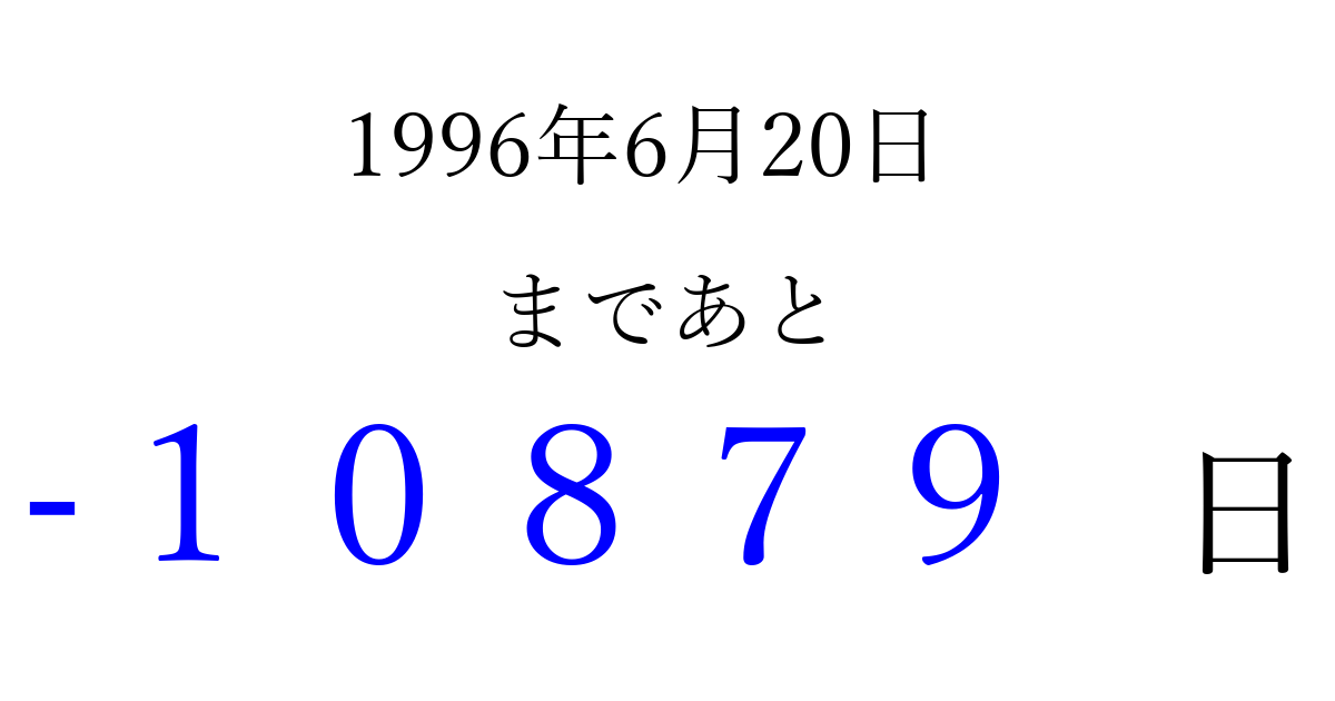 1996年6月20日(木)は もう 00000 日過ぎました 追加すると、トップページからすぐ選べるようになります ※2026/04/03現在の結果です。 最新の状態に更新する ↓シェアして、タイムライン上にカウントダウンを表示しよう!↓ 📤 この結果を共有する Tweet シェア Threads Bluesky 別の日付でカウントダウン 1996年6月のカレンダー このページをブックマークに追加すると、いつでもカウントダウンを確認できます。 (PC: Ctrl+D / Mac: ⌘+D) hitome-notes.comでは以下のページも運営しています。 指定日と期間から日付を計算 | ガチャ確率計算・シミュレーション | プライバシー・ポリシー 運営者:Avocado
