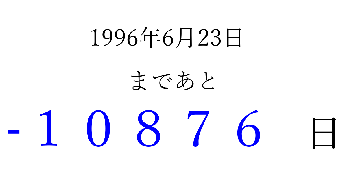 1996年6月23日(日)は もう 00000 日過ぎました 追加すると、トップページからすぐ選べるようになります ※2026/04/03現在の結果です。 最新の状態に更新する ↓シェアして、タイムライン上にカウントダウンを表示しよう!↓ 📤 この結果を共有する Tweet シェア Threads Bluesky 別の日付でカウントダウン 1996年6月のカレンダー このページをブックマークに追加すると、いつでもカウントダウンを確認できます。 (PC: Ctrl+D / Mac: ⌘+D) hitome-notes.comでは以下のページも運営しています。 指定日と期間から日付を計算 | ガチャ確率計算・シミュレーション | プライバシー・ポリシー 運営者:Avocado