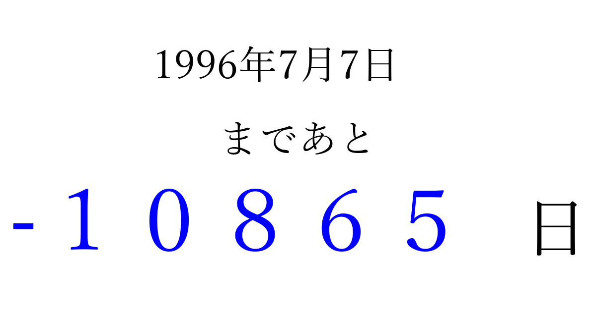 1996年7月7日(日)は もう 00000 日過ぎました 追加すると、トップページからすぐ選べるようになります ※2026/04/06現在の結果です。 最新の状態に更新する ↓シェアして、タイムライン上にカウントダウンを表示しよう!↓ 📤 この結果を共有する Tweet シェア Threads Bluesky 別の日付でカウントダウン 1996年7月のカレンダー このページをブックマークに追加すると、いつでもカウントダウンを確認できます。 (PC: Ctrl+D / Mac: ⌘+D) hitome-notes.comでは以下のページも運営しています。 指定日と期間から日付を計算 | ガチャ確率計算・シミュレーション | プライバシー・ポリシー 運営者:Avocado