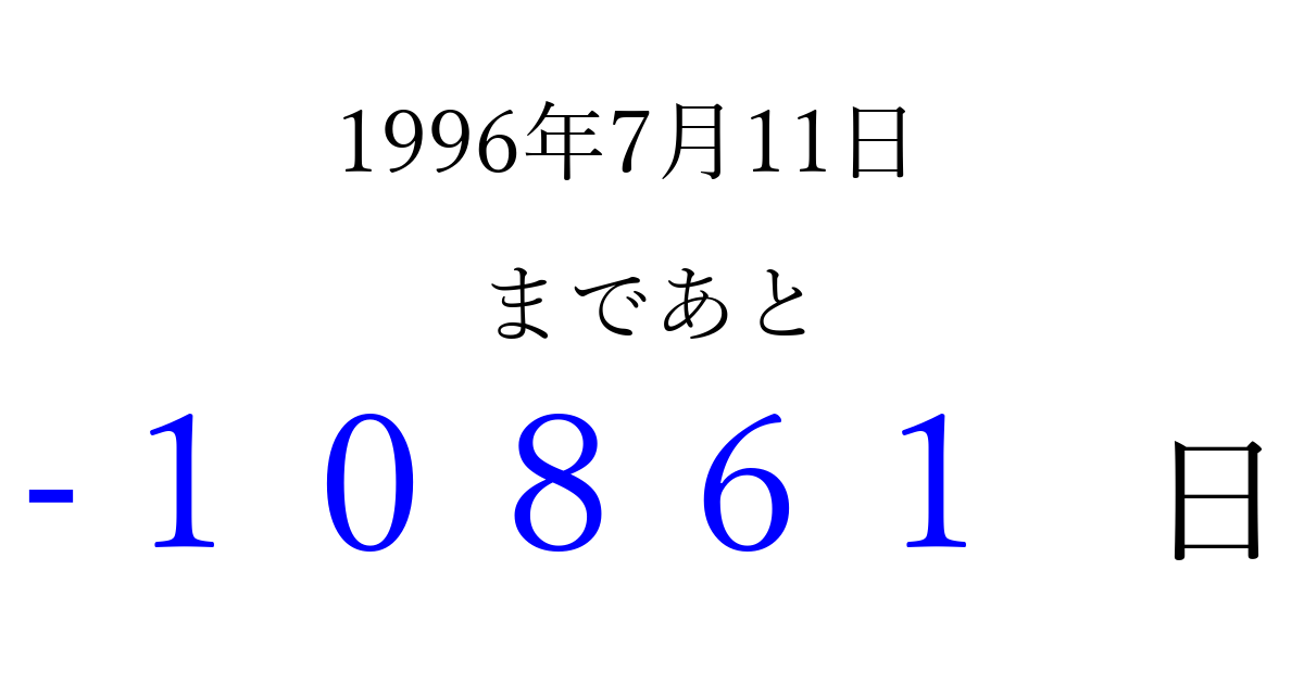 1996年7月11日(木)は もう 00000 日過ぎました 追加すると、トップページからすぐ選べるようになります ※2026/04/06現在の結果です。 最新の状態に更新する ↓シェアして、タイムライン上にカウントダウンを表示しよう!↓ 📤 この結果を共有する Tweet シェア Threads Bluesky 別の日付でカウントダウン 1996年7月のカレンダー このページをブックマークに追加すると、いつでもカウントダウンを確認できます。 (PC: Ctrl+D / Mac: ⌘+D) hitome-notes.comでは以下のページも運営しています。 指定日と期間から日付を計算 | ガチャ確率計算・シミュレーション | プライバシー・ポリシー 運営者:Avocado