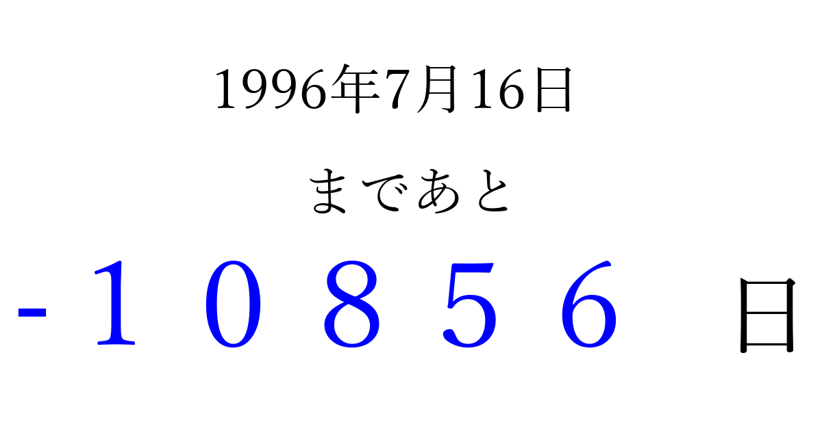 1996年7月16日(火)は もう 00000 日過ぎました 追加すると、トップページからすぐ選べるようになります ※2026/04/06現在の結果です。 最新の状態に更新する ↓シェアして、タイムライン上にカウントダウンを表示しよう!↓ 📤 この結果を共有する Tweet シェア Threads Bluesky 別の日付でカウントダウン 1996年7月のカレンダー このページをブックマークに追加すると、いつでもカウントダウンを確認できます。 (PC: Ctrl+D / Mac: ⌘+D) hitome-notes.comでは以下のページも運営しています。 指定日と期間から日付を計算 | ガチャ確率計算・シミュレーション | プライバシー・ポリシー 運営者:Avocado