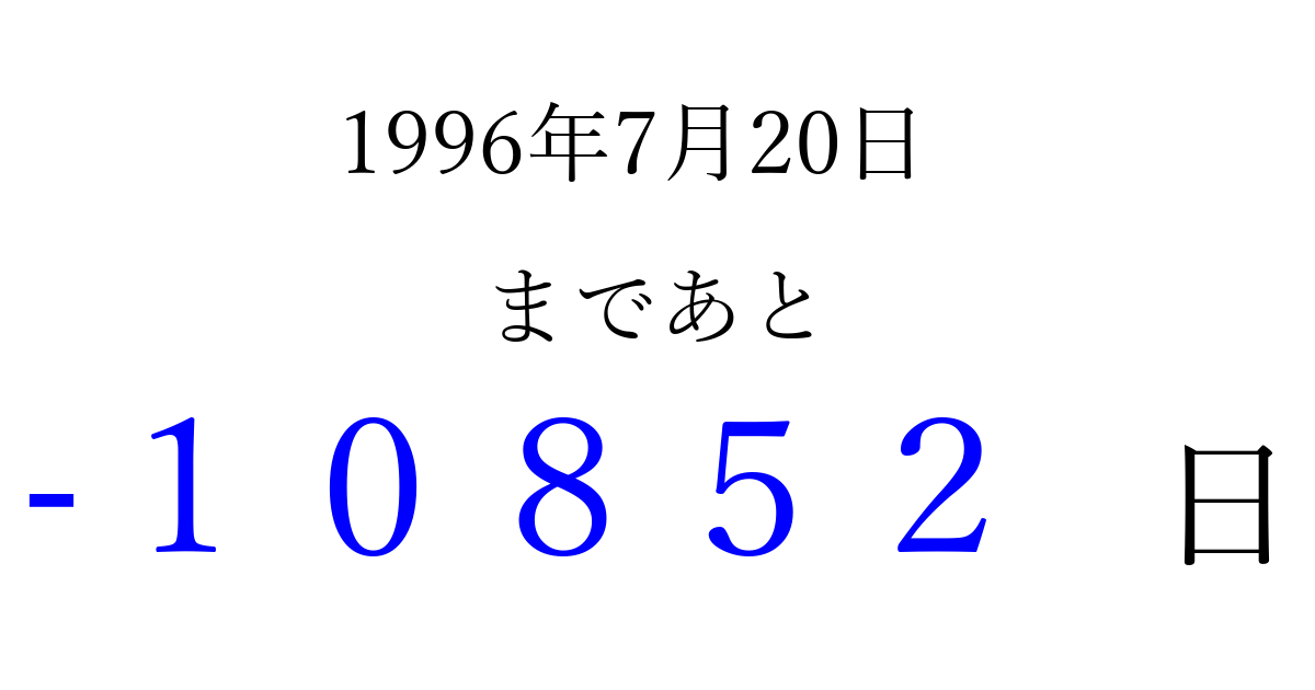 1996年7月20日(土)は もう 00000 日過ぎました 追加すると、トップページからすぐ選べるようになります ※2026/04/06現在の結果です。 最新の状態に更新する ↓シェアして、タイムライン上にカウントダウンを表示しよう!↓ 📤 この結果を共有する Tweet シェア Threads Bluesky 別の日付でカウントダウン 1996年7月のカレンダー このページをブックマークに追加すると、いつでもカウントダウンを確認できます。 (PC: Ctrl+D / Mac: ⌘+D) hitome-notes.comでは以下のページも運営しています。 指定日と期間から日付を計算 | ガチャ確率計算・シミュレーション | プライバシー・ポリシー 運営者:Avocado