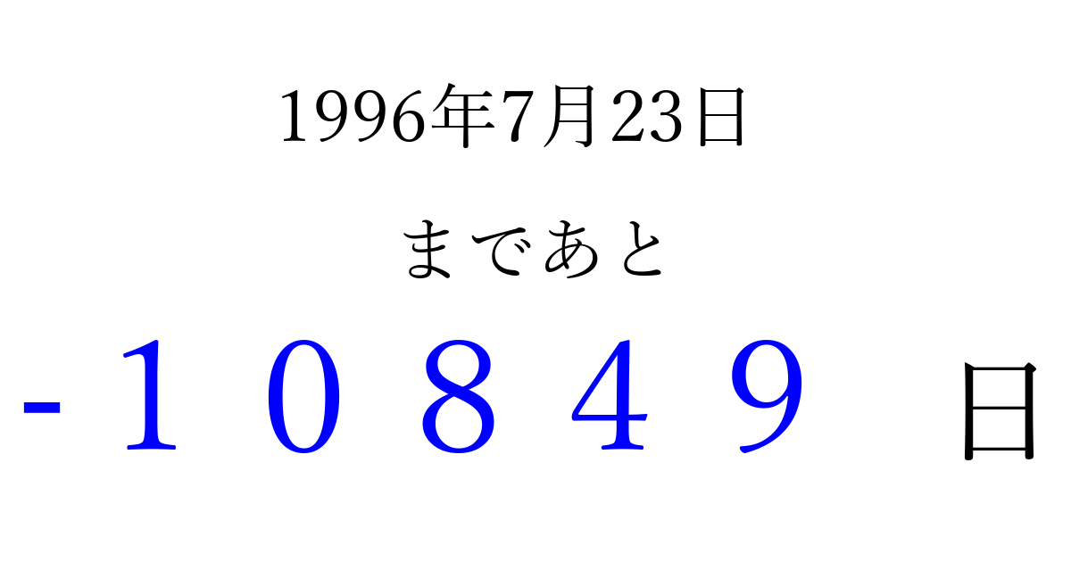 1996年7月23日(火)は もう 00000 日過ぎました 追加すると、トップページからすぐ選べるようになります ※2026/04/06現在の結果です。 最新の状態に更新する ↓シェアして、タイムライン上にカウントダウンを表示しよう!↓ 📤 この結果を共有する Tweet シェア Threads Bluesky 別の日付でカウントダウン 1996年7月のカレンダー このページをブックマークに追加すると、いつでもカウントダウンを確認できます。 (PC: Ctrl+D / Mac: ⌘+D) hitome-notes.comでは以下のページも運営しています。 指定日と期間から日付を計算 | ガチャ確率計算・シミュレーション | プライバシー・ポリシー 運営者:Avocado