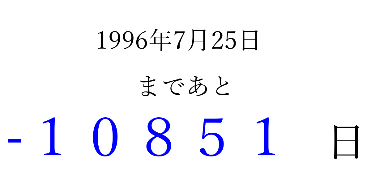 1996年7月25日(木)は もう 00000 日過ぎました 追加すると、トップページからすぐ選べるようになります ※2026/04/10現在の結果です。 最新の状態に更新する ↓シェアして、タイムライン上にカウントダウンを表示しよう!↓ 📤 この結果を共有する Tweet シェア Threads Bluesky 別の日付でカウントダウン 1996年7月のカレンダー このページをブックマークに追加すると、いつでもカウントダウンを確認できます。 (PC: Ctrl+D / Mac: ⌘+D) hitome-notes.comでは以下のページも運営しています。 指定日と期間から日付を計算 | ガチャ確率計算・シミュレーション | プライバシー・ポリシー 運営者:Avocado