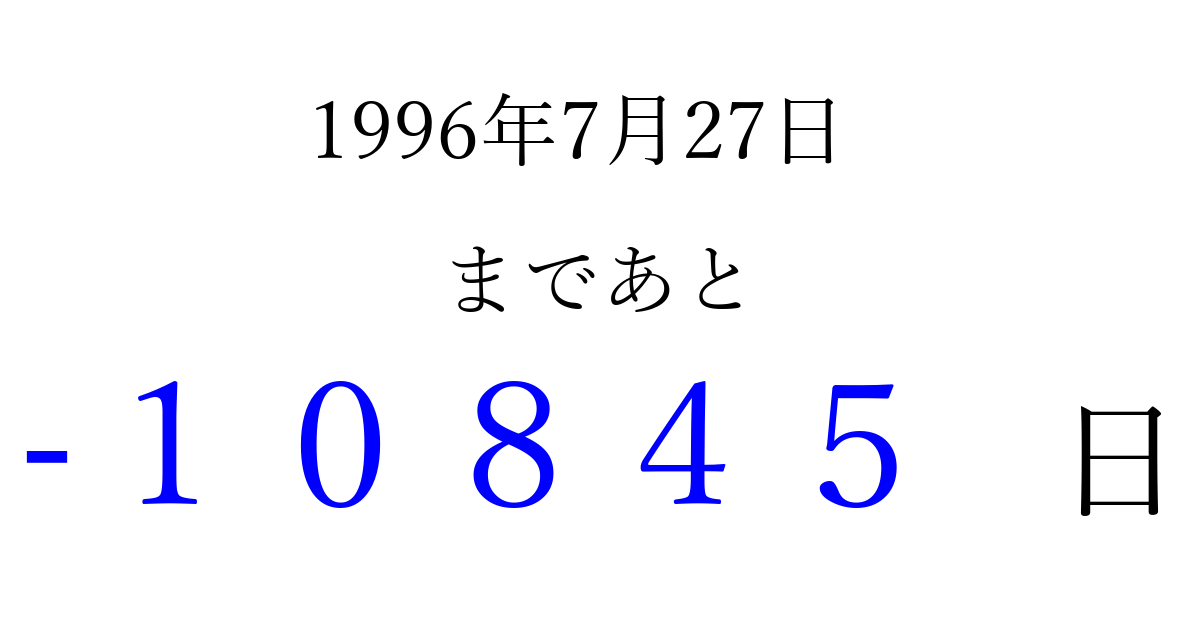 1996年7月27日(土)は もう 00000 日過ぎました 追加すると、トップページからすぐ選べるようになります ※2026/04/06現在の結果です。 最新の状態に更新する ↓シェアして、タイムライン上にカウントダウンを表示しよう!↓ 📤 この結果を共有する Tweet シェア Threads Bluesky 別の日付でカウントダウン 1996年7月のカレンダー このページをブックマークに追加すると、いつでもカウントダウンを確認できます。 (PC: Ctrl+D / Mac: ⌘+D) hitome-notes.comでは以下のページも運営しています。 指定日と期間から日付を計算 | ガチャ確率計算・シミュレーション | プライバシー・ポリシー 運営者:Avocado