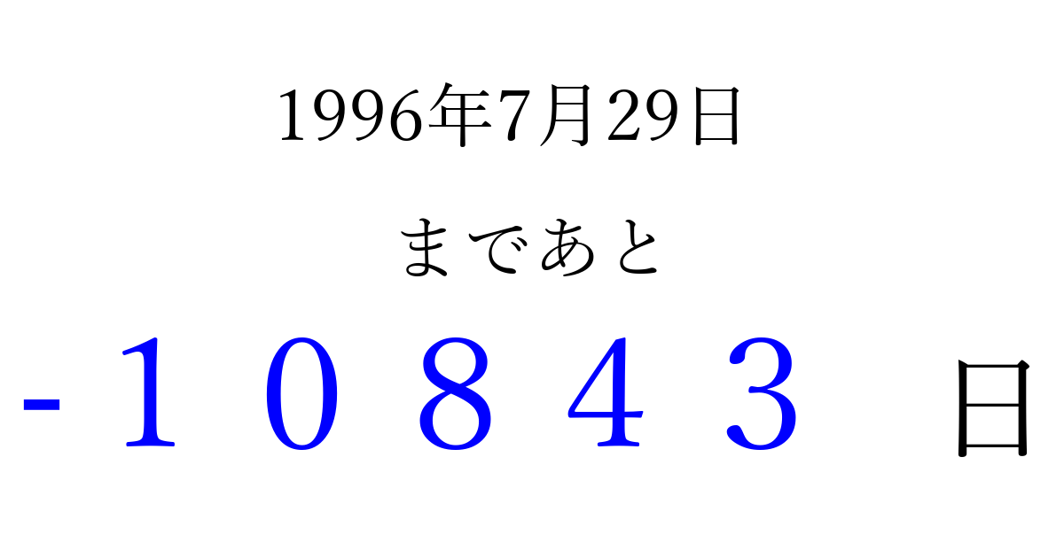 1996年7月29日(月)は もう 00000 日過ぎました 追加すると、トップページからすぐ選べるようになります ※2026/04/06現在の結果です。 最新の状態に更新する ↓シェアして、タイムライン上にカウントダウンを表示しよう!↓ 📤 この結果を共有する Tweet シェア Threads Bluesky 別の日付でカウントダウン 1996年7月のカレンダー このページをブックマークに追加すると、いつでもカウントダウンを確認できます。 (PC: Ctrl+D / Mac: ⌘+D) hitome-notes.comでは以下のページも運営しています。 指定日と期間から日付を計算 | ガチャ確率計算・シミュレーション | プライバシー・ポリシー 運営者:Avocado