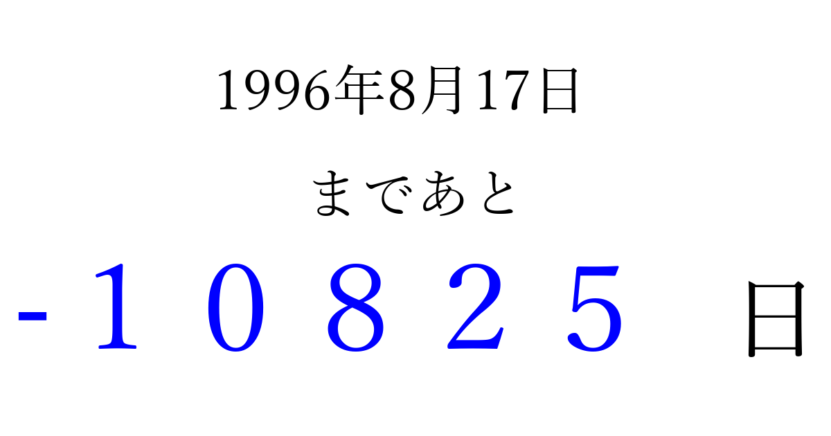 1996年8月17日(土)は もう 00000 日過ぎました 追加すると、トップページからすぐ選べるようになります ※2026/04/07現在の結果です。 最新の状態に更新する ↓シェアして、タイムライン上にカウントダウンを表示しよう!↓ 📤 この結果を共有する Tweet シェア Threads Bluesky 別の日付でカウントダウン 1996年8月のカレンダー このページをブックマークに追加すると、いつでもカウントダウンを確認できます。 (PC: Ctrl+D / Mac: ⌘+D) hitome-notes.comでは以下のページも運営しています。 指定日と期間から日付を計算 | ガチャ確率計算・シミュレーション | プライバシー・ポリシー 運営者:Avocado