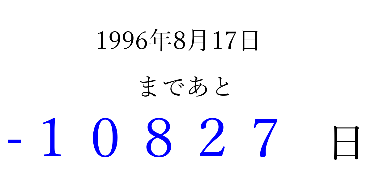 1996年8月17日(土)は もう 00000 日過ぎました 追加すると、トップページからすぐ選べるようになります ※2026/04/09現在の結果です。 最新の状態に更新する ↓シェアして、タイムライン上にカウントダウンを表示しよう!↓ 📤 この結果を共有する Tweet シェア Threads Bluesky 別の日付でカウントダウン 1996年8月のカレンダー このページをブックマークに追加すると、いつでもカウントダウンを確認できます。 (PC: Ctrl+D / Mac: ⌘+D) hitome-notes.comでは以下のページも運営しています。 指定日と期間から日付を計算 | ガチャ確率計算・シミュレーション | プライバシー・ポリシー 運営者:Avocado