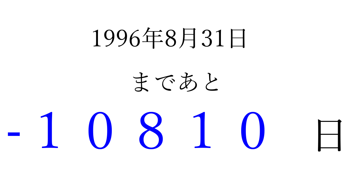 1996年8月31日(土)は もう 00000 日過ぎました 追加すると、トップページからすぐ選べるようになります ※2026/04/06現在の結果です。 最新の状態に更新する ↓シェアして、タイムライン上にカウントダウンを表示しよう!↓ 📤 この結果を共有する Tweet シェア Threads Bluesky 別の日付でカウントダウン 1996年8月のカレンダー このページをブックマークに追加すると、いつでもカウントダウンを確認できます。 (PC: Ctrl+D / Mac: ⌘+D) hitome-notes.comでは以下のページも運営しています。 指定日と期間から日付を計算 | ガチャ確率計算・シミュレーション | プライバシー・ポリシー 運営者:Avocado