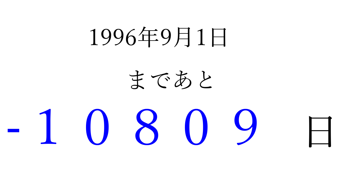 1996年9月1日(日)は もう 00000 日過ぎました 追加すると、トップページからすぐ選べるようになります ※2026/04/06現在の結果です。 最新の状態に更新する ↓シェアして、タイムライン上にカウントダウンを表示しよう!↓ 📤 この結果を共有する Tweet シェア Threads Bluesky 別の日付でカウントダウン 1996年9月のカレンダー このページをブックマークに追加すると、いつでもカウントダウンを確認できます。 (PC: Ctrl+D / Mac: ⌘+D) hitome-notes.comでは以下のページも運営しています。 指定日と期間から日付を計算 | ガチャ確率計算・シミュレーション | プライバシー・ポリシー 運営者:Avocado