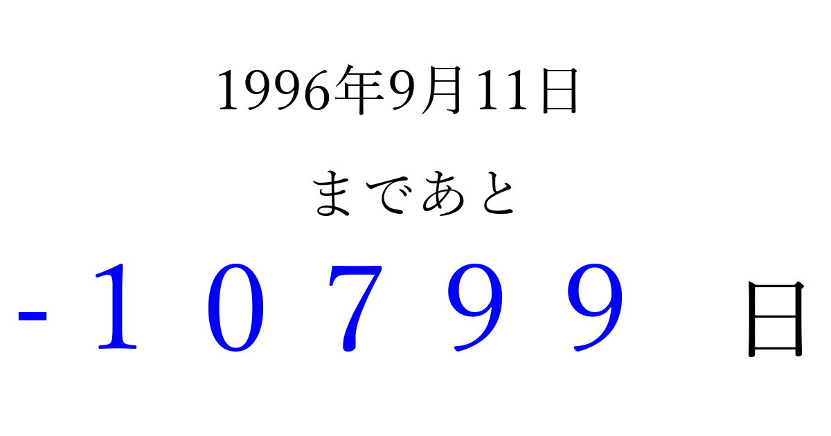 1996年9月11日(水)は もう 00000 日過ぎました 追加すると、トップページからすぐ選べるようになります ※2026/04/06現在の結果です。 最新の状態に更新する ↓シェアして、タイムライン上にカウントダウンを表示しよう!↓ 📤 この結果を共有する Tweet シェア Threads Bluesky 別の日付でカウントダウン 1996年9月のカレンダー このページをブックマークに追加すると、いつでもカウントダウンを確認できます。 (PC: Ctrl+D / Mac: ⌘+D) hitome-notes.comでは以下のページも運営しています。 指定日と期間から日付を計算 | ガチャ確率計算・シミュレーション | プライバシー・ポリシー 運営者:Avocado