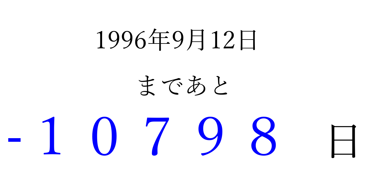 1996年9月12日(木)は もう 00000 日過ぎました 追加すると、トップページからすぐ選べるようになります ※2026/04/06現在の結果です。 最新の状態に更新する ↓シェアして、タイムライン上にカウントダウンを表示しよう!↓ 📤 この結果を共有する Tweet シェア Threads Bluesky 別の日付でカウントダウン 1996年9月のカレンダー このページをブックマークに追加すると、いつでもカウントダウンを確認できます。 (PC: Ctrl+D / Mac: ⌘+D) hitome-notes.comでは以下のページも運営しています。 指定日と期間から日付を計算 | ガチャ確率計算・シミュレーション | プライバシー・ポリシー 運営者:Avocado