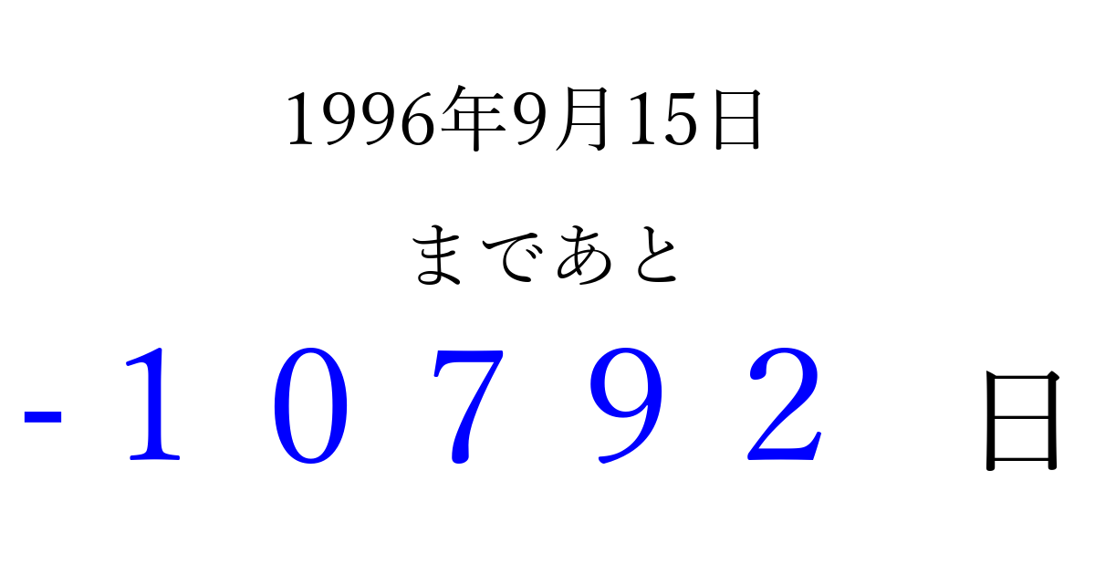 1996年9月15日(日)は もう 00000 日過ぎました 追加すると、トップページからすぐ選べるようになります ※2026/04/03現在の結果です。 最新の状態に更新する ↓シェアして、タイムライン上にカウントダウンを表示しよう!↓ 📤 この結果を共有する Tweet シェア Threads Bluesky 別の日付でカウントダウン 1996年9月のカレンダー このページをブックマークに追加すると、いつでもカウントダウンを確認できます。 (PC: Ctrl+D / Mac: ⌘+D) hitome-notes.comでは以下のページも運営しています。 指定日と期間から日付を計算 | ガチャ確率計算・シミュレーション | プライバシー・ポリシー 運営者:Avocado
