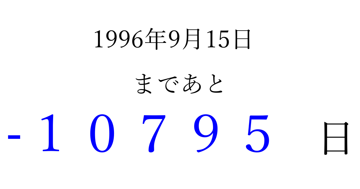 1996年9月15日(日)は もう 00000 日過ぎました 追加すると、トップページからすぐ選べるようになります ※2026/04/06現在の結果です。 最新の状態に更新する ↓シェアして、タイムライン上にカウントダウンを表示しよう!↓ 📤 この結果を共有する Tweet シェア Threads Bluesky 別の日付でカウントダウン 1996年9月のカレンダー このページをブックマークに追加すると、いつでもカウントダウンを確認できます。 (PC: Ctrl+D / Mac: ⌘+D) hitome-notes.comでは以下のページも運営しています。 指定日と期間から日付を計算 | ガチャ確率計算・シミュレーション | プライバシー・ポリシー 運営者:Avocado