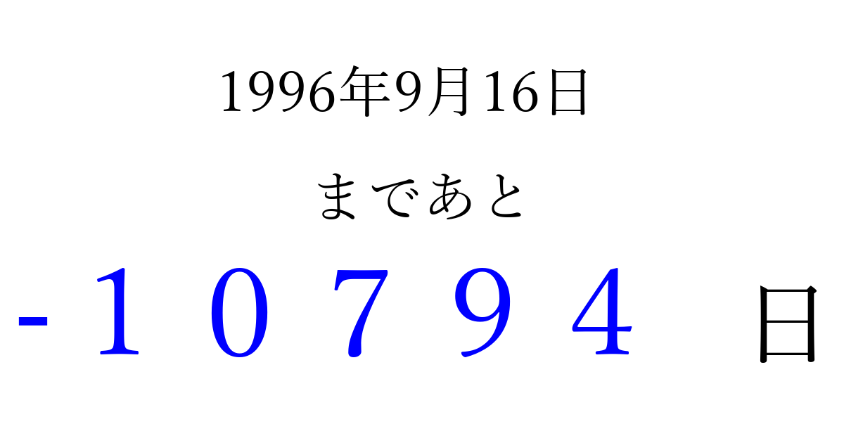 1996年9月16日(月)は もう 00000 日過ぎました 追加すると、トップページからすぐ選べるようになります ※2026/04/06現在の結果です。 最新の状態に更新する ↓シェアして、タイムライン上にカウントダウンを表示しよう!↓ 📤 この結果を共有する Tweet シェア Threads Bluesky 別の日付でカウントダウン 1996年9月のカレンダー このページをブックマークに追加すると、いつでもカウントダウンを確認できます。 (PC: Ctrl+D / Mac: ⌘+D) hitome-notes.comでは以下のページも運営しています。 指定日と期間から日付を計算 | ガチャ確率計算・シミュレーション | プライバシー・ポリシー 運営者:Avocado