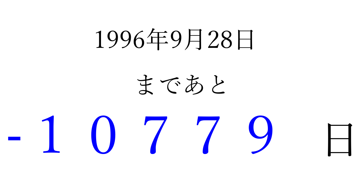 1996年9月28日(土)は もう 00000 日過ぎました 追加すると、トップページからすぐ選べるようになります ※2026/04/03現在の結果です。 最新の状態に更新する ↓シェアして、タイムライン上にカウントダウンを表示しよう!↓ 📤 この結果を共有する Tweet シェア Threads Bluesky 別の日付でカウントダウン 1996年9月のカレンダー このページをブックマークに追加すると、いつでもカウントダウンを確認できます。 (PC: Ctrl+D / Mac: ⌘+D) hitome-notes.comでは以下のページも運営しています。 指定日と期間から日付を計算 | ガチャ確率計算・シミュレーション | プライバシー・ポリシー 運営者:Avocado