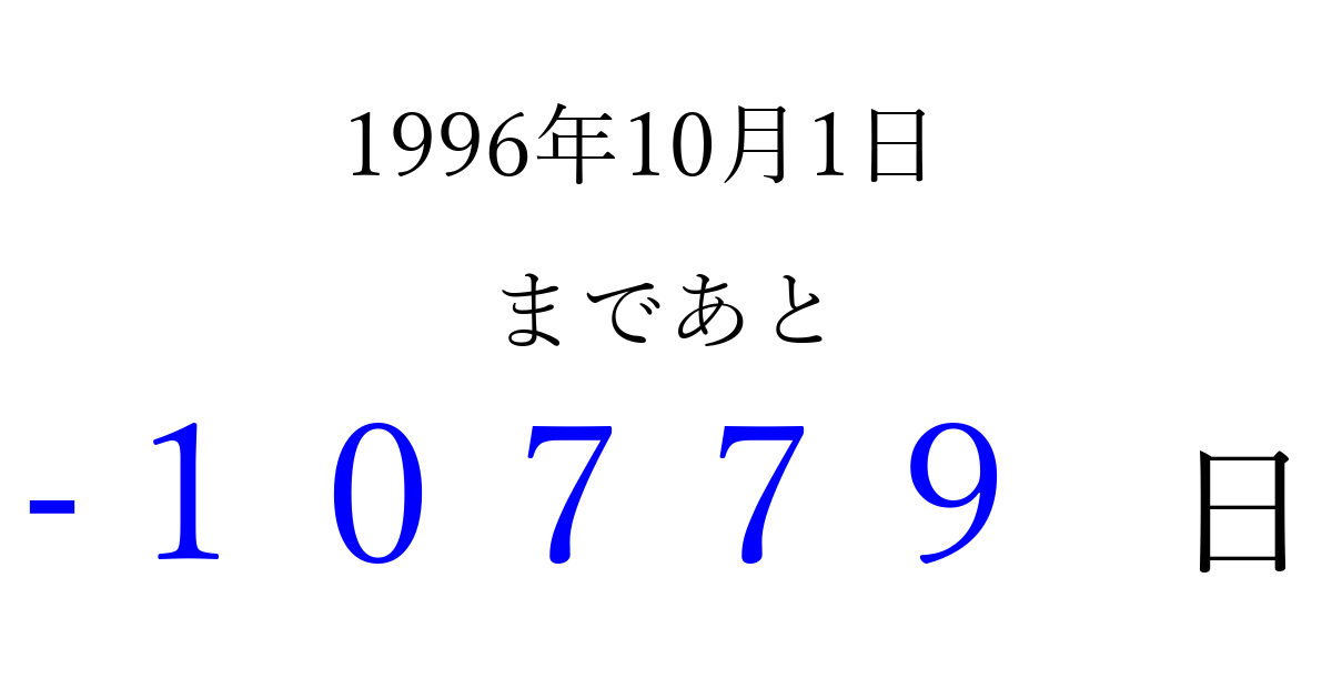 1996年10月1日(火)は もう 00000 日過ぎました 追加すると、トップページからすぐ選べるようになります ※2026/04/06現在の結果です。 最新の状態に更新する ↓シェアして、タイムライン上にカウントダウンを表示しよう!↓ 📤 この結果を共有する Tweet シェア Threads Bluesky 別の日付でカウントダウン 1996年10月のカレンダー このページをブックマークに追加すると、いつでもカウントダウンを確認できます。 (PC: Ctrl+D / Mac: ⌘+D) hitome-notes.comでは以下のページも運営しています。 指定日と期間から日付を計算 | ガチャ確率計算・シミュレーション | プライバシー・ポリシー 運営者:Avocado