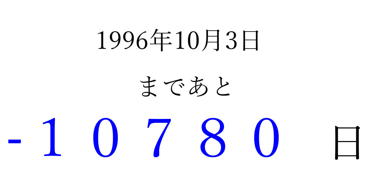 1996年10月3日(木)は もう 00000 日過ぎました 追加すると、トップページからすぐ選べるようになります ※2026/04/09現在の結果です。 最新の状態に更新する ↓シェアして、タイムライン上にカウントダウンを表示しよう!↓ 📤 この結果を共有する Tweet シェア Threads Bluesky 別の日付でカウントダウン 1996年10月のカレンダー このページをブックマークに追加すると、いつでもカウントダウンを確認できます。 (PC: Ctrl+D / Mac: ⌘+D) hitome-notes.comでは以下のページも運営しています。 指定日と期間から日付を計算 | ガチャ確率計算・シミュレーション | プライバシー・ポリシー 運営者:Avocado