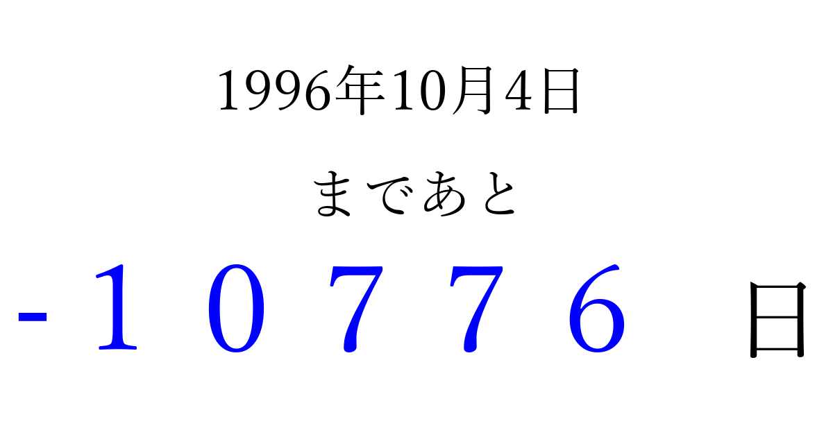 1996年10月4日(金)は もう 00000 日過ぎました 追加すると、トップページからすぐ選べるようになります ※2026/04/06現在の結果です。 最新の状態に更新する ↓シェアして、タイムライン上にカウントダウンを表示しよう!↓ 📤 この結果を共有する Tweet シェア Threads Bluesky 別の日付でカウントダウン 1996年10月のカレンダー このページをブックマークに追加すると、いつでもカウントダウンを確認できます。 (PC: Ctrl+D / Mac: ⌘+D) hitome-notes.comでは以下のページも運営しています。 指定日と期間から日付を計算 | ガチャ確率計算・シミュレーション | プライバシー・ポリシー 運営者:Avocado